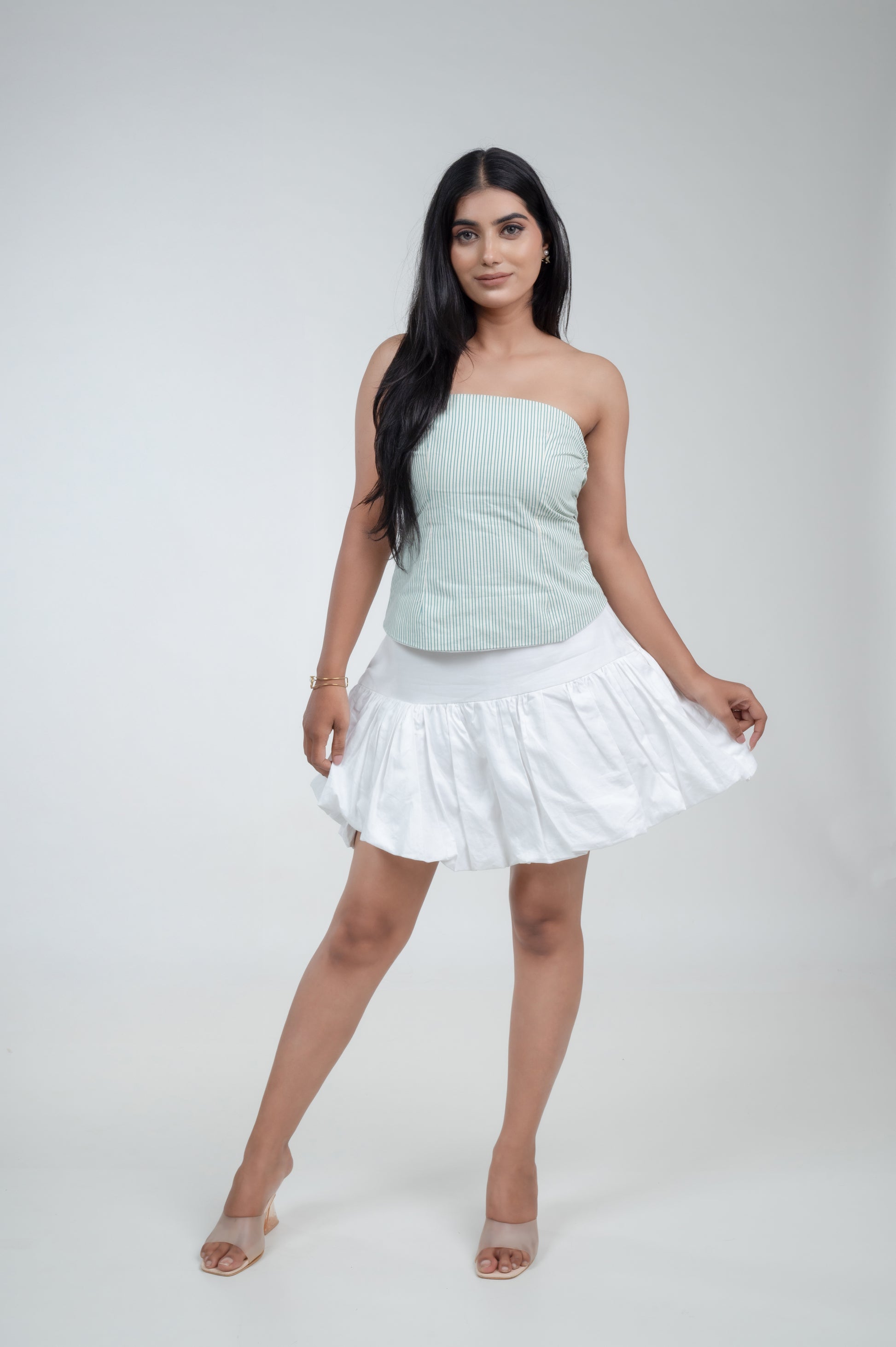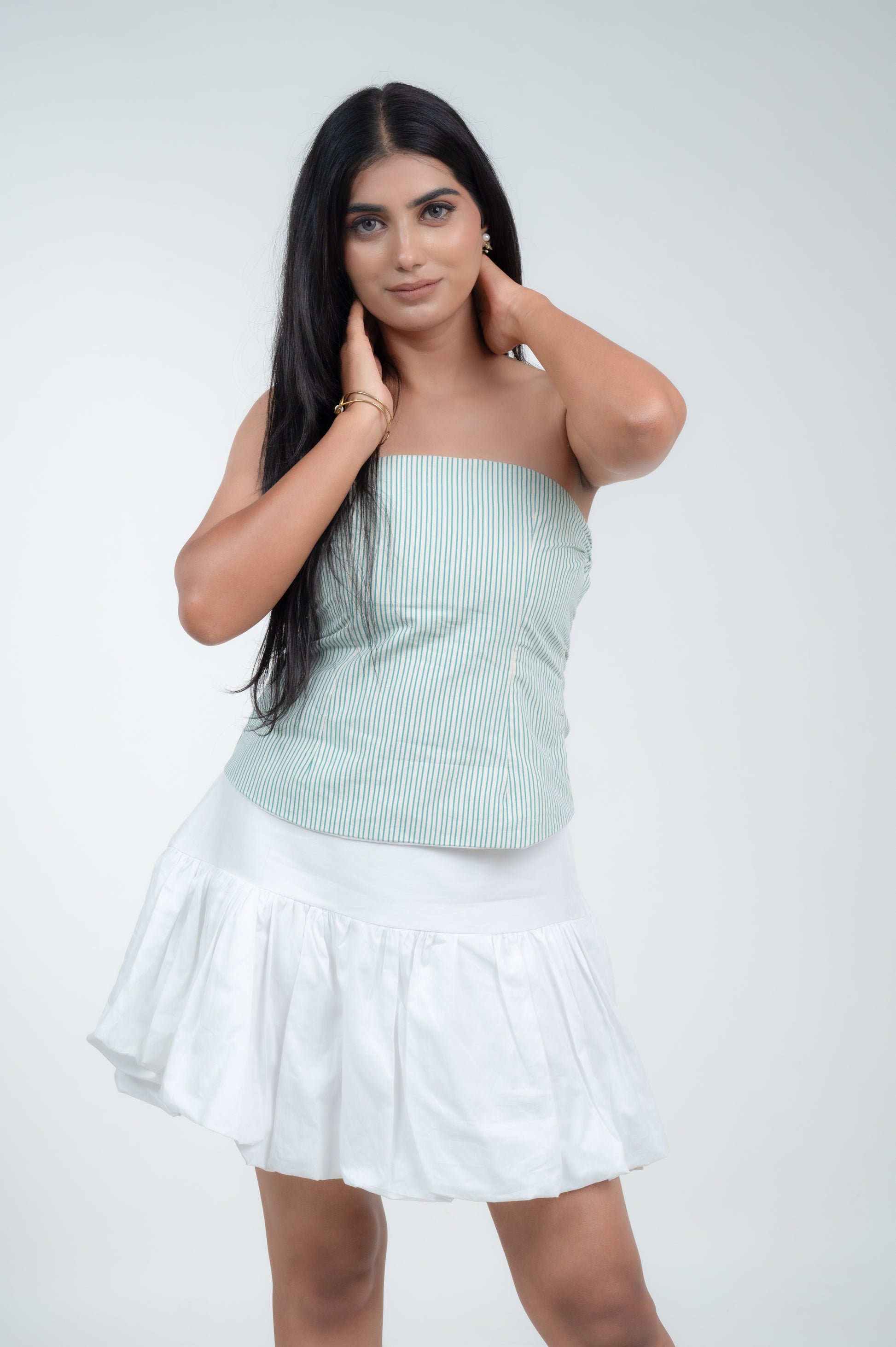 A chic mint green cotton striped corset top, designed with a structured fit for a flattering silhouette. Perfect to pair with skirts, denims, or trousers for an effortlessly stylish look.