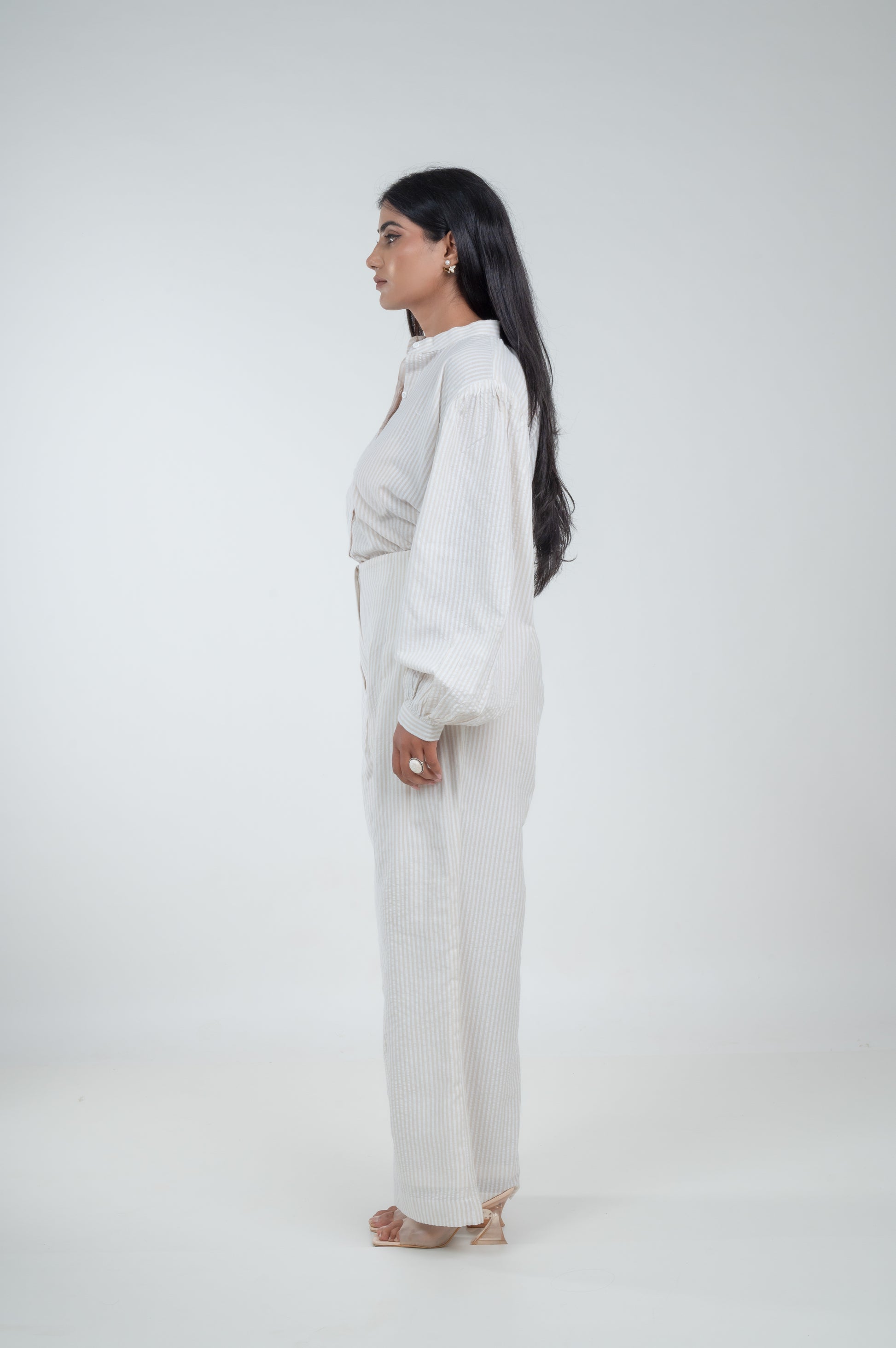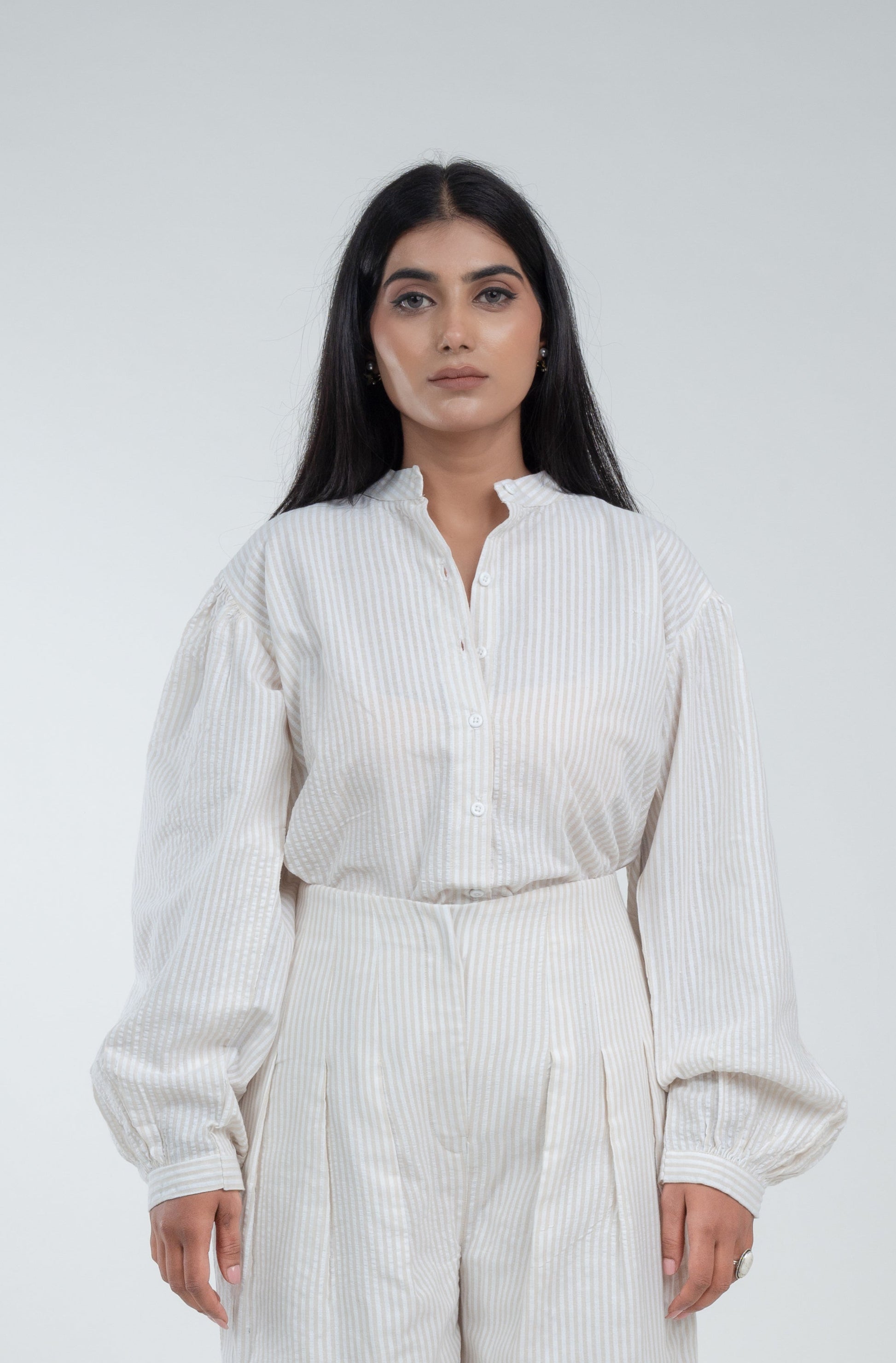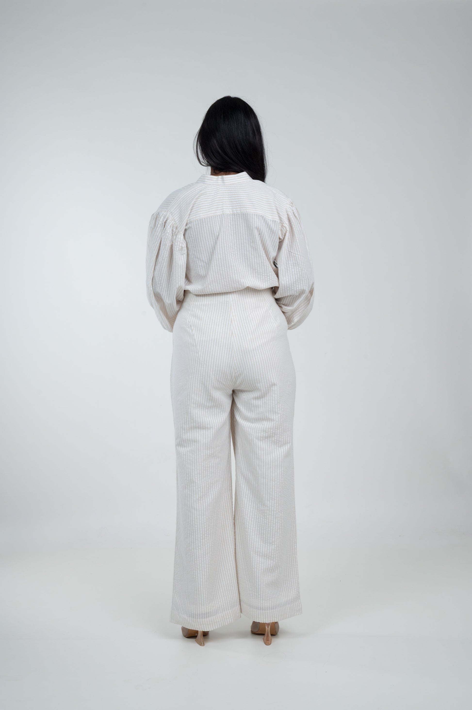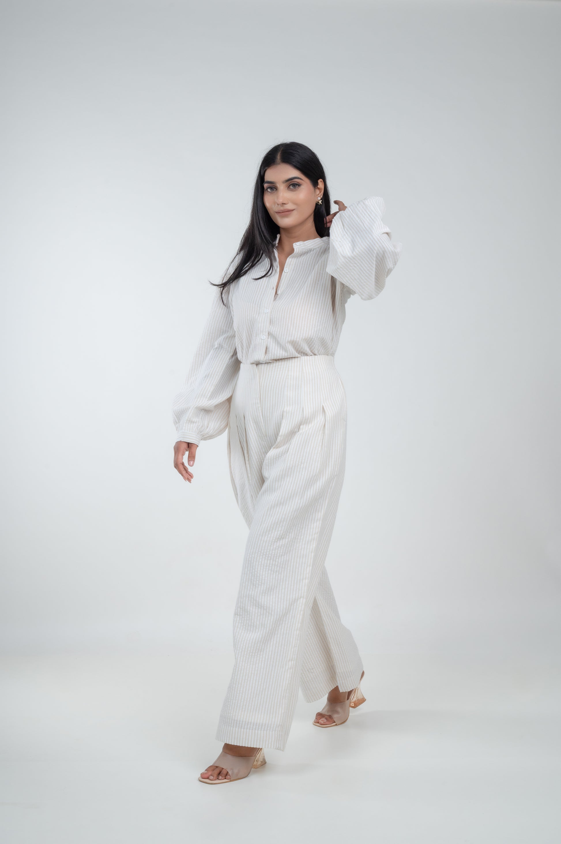 Minimal elegance meets everyday ease. Beiggy Bae is tailored from airy seersucker fabric, offering a textured yet breathable feel. The Mandarin collar adds a refined edge, while the balloon sleeves bring subtle drama. Paired with high-waisted, wide-leg trousers featuring clean pleats, this co-ord is designed for both structure and flow.