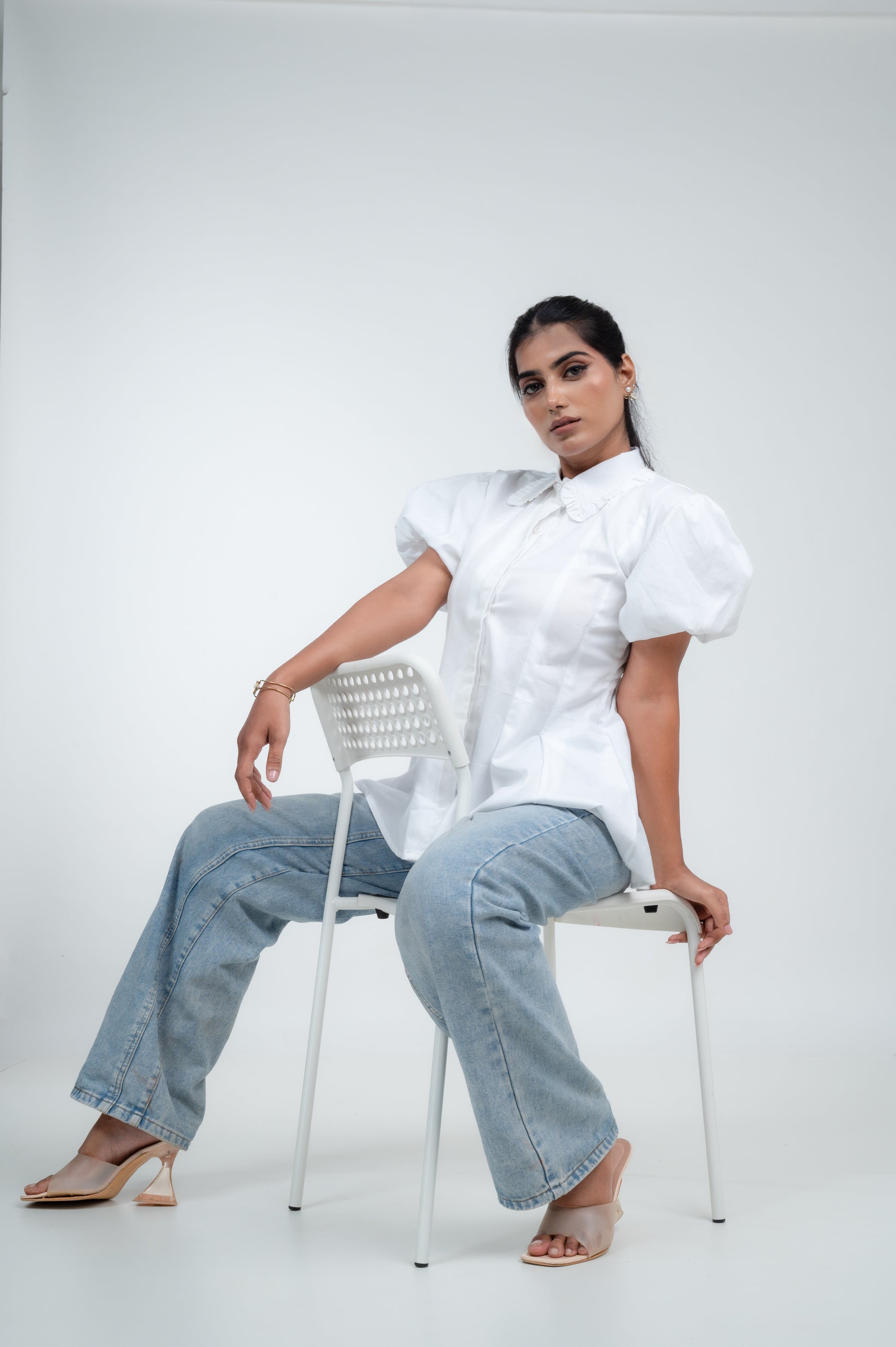 A chic white balloon sleeve top with four front darts for a flattering fit and a soft flared hem for added movement. Crafted in breathable cotton, perfect for effortless day-to-night styling.