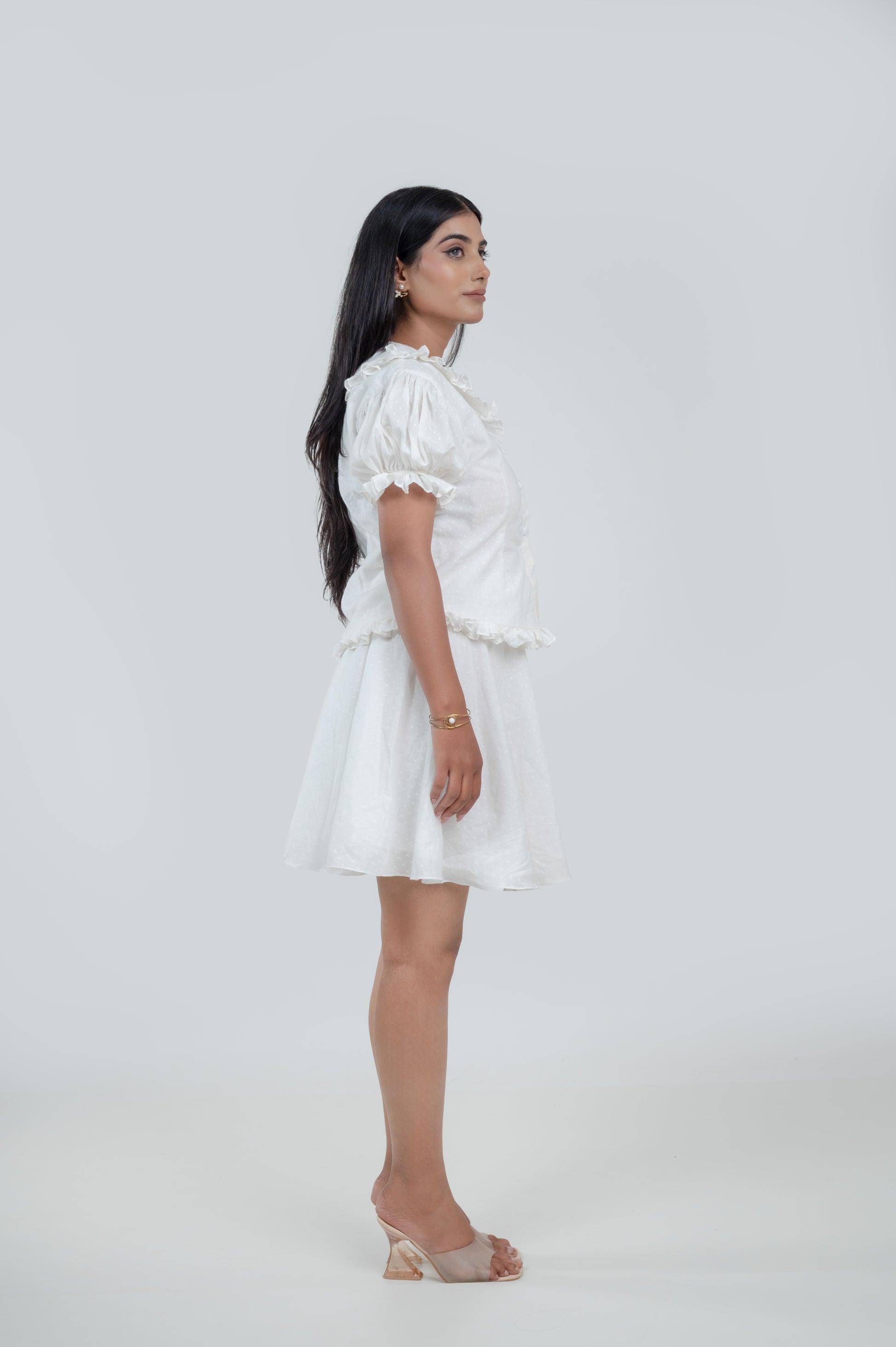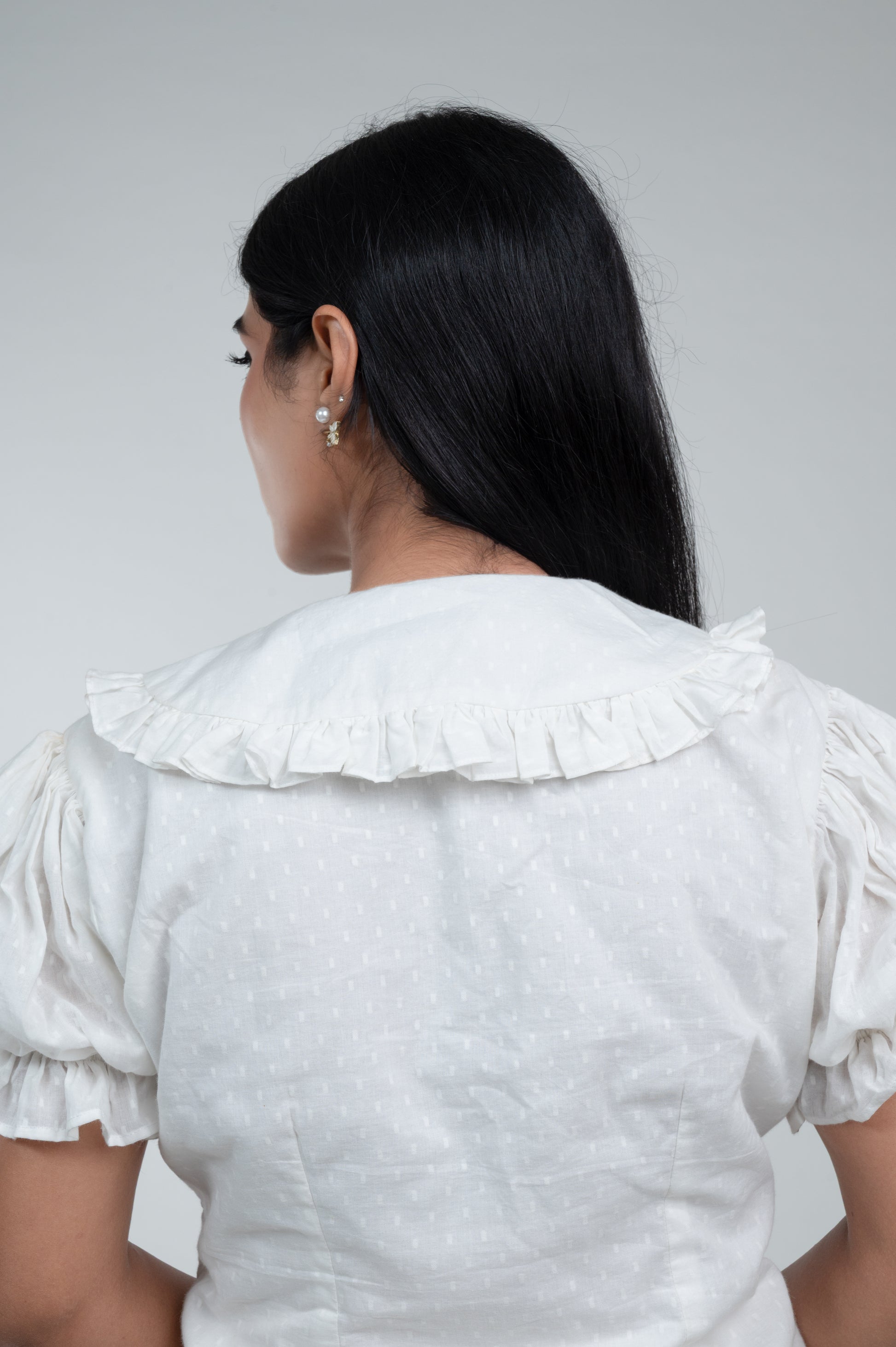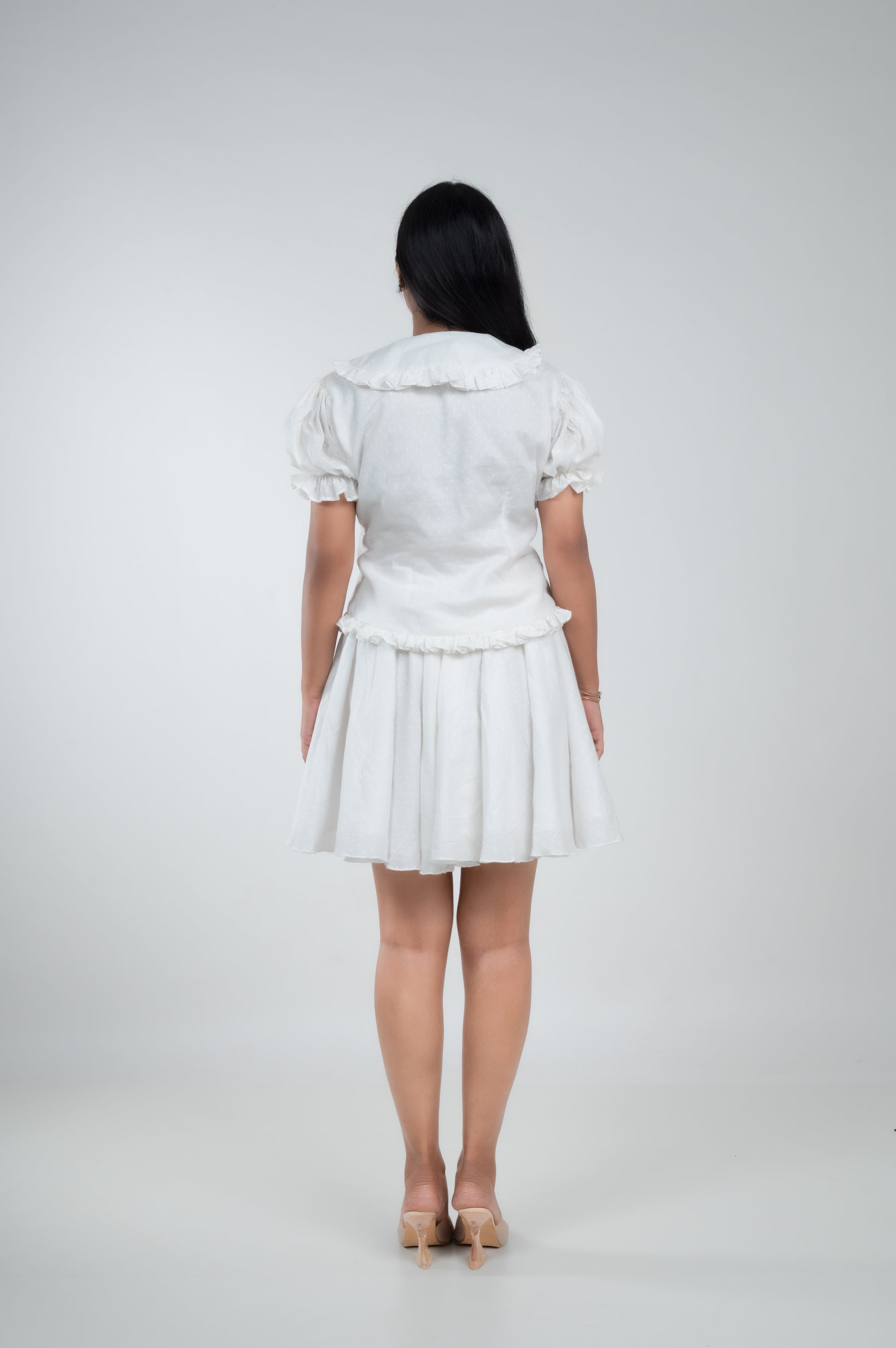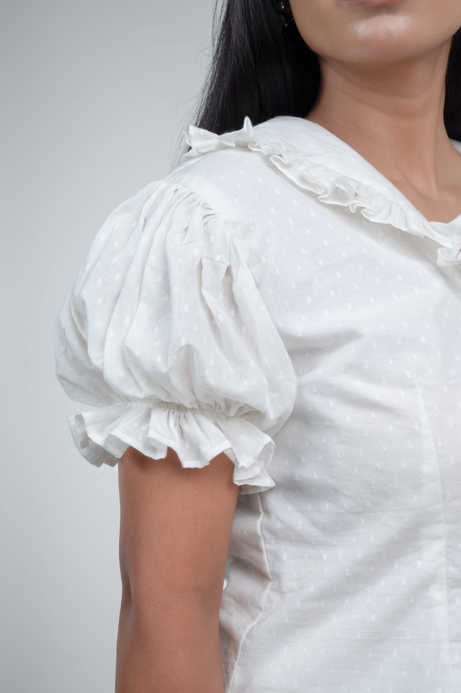 The Adiraa Belle Dress is a dreamy fusion of vintage romance and modern elegance. Crafted in breathable sheer cotton, this ivory-white dress features a collared V-neckline with delicate ruffle trims, adding a soft feminine touch. The puff sleeves with gathered hems create a voluminous yet graceful silhouette, while the gentle ruffle detailing at the waistline enhances its playful charm. Flowing into an A-line skirt, it strikes the perfect balance between retro chic and contemporary wearability.